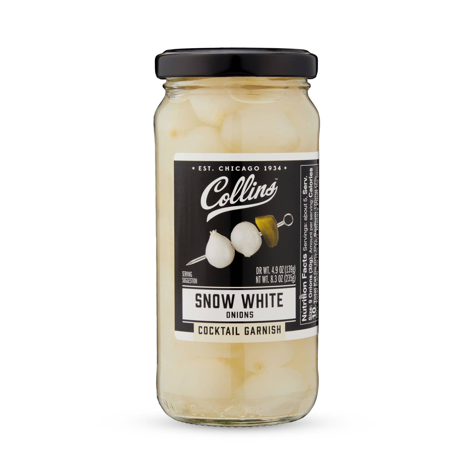 Pickled in vinegar, Collins Snow White Onions are the perfect finishing touch to cocktails and other drinks.